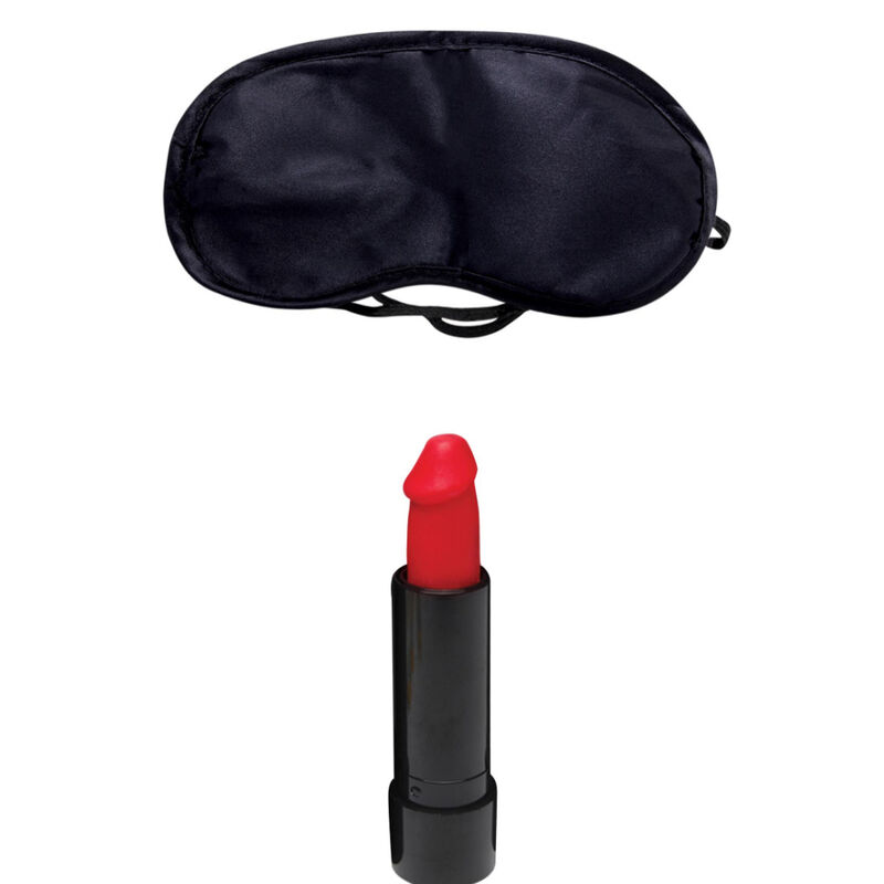 Jogo de “Kiss My…!” composto por um poster com um homem, um batom em forma de pénis e uma máscara.