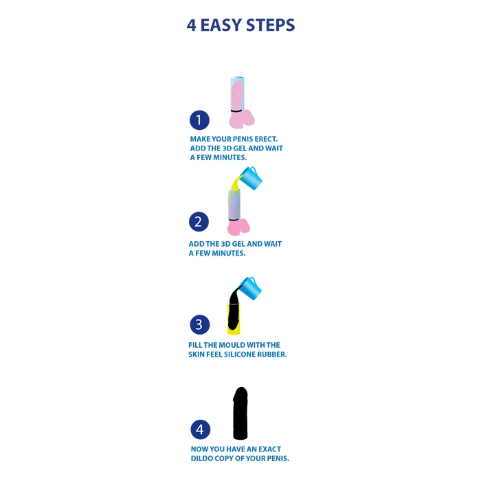 Siga as instruções detalhadas no interior da embalagem. Corte o plástico e coloque a manga numa das pontas para servir de vedante. Mantenha o pénis em ereção, de seguida coloque o anel na base do pénis. Misture o gel 3D com àgua. Coloque o gel sobre o pénis envolto na embalagem plástica. Aguarde cerca de 3 minutos e retire o pénis. Abra a embalagem de silicone e mexa, coloque no molde. Passados uns minutos retire e tem uma réplica perfeita do seu pénis.